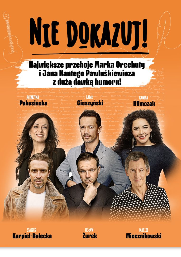 „Nie dokazuj! Największe przeboje Marka Grechuty” to wydarzenie, które łączy muzykę, humor i niezwykłą charyzmę artystów, oferując publiczności niezapomniane emocje. To koncert, który bawi, wzrusza i angażuje – nie przegap tej wyjątkowej okazji, by poczuć magię Grechuty na żywo!